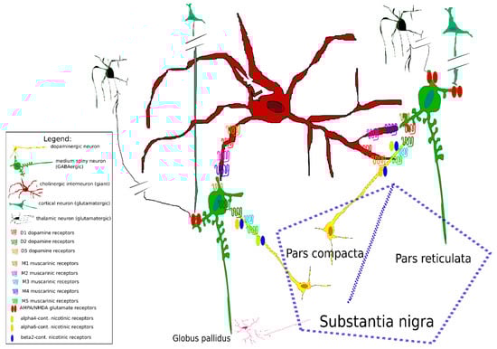 The morphology of striatal connections is shown in Figure 1. In general, the main striatal neurons comprise dopaminergic medium spiny neurons that have specific efferentation (to pars reticulata, substantia nigra (the direct pathway) or to globus pallidus (the indirect pathway)) and cholinergic interneurons, which are important neuronal modulators of other (mainly medium spiny) neurons [3,20,28]. Furthermore, we will briefly describe the classic scheme of interaction between these neurons, and we will focus on some data that have cast doubt on this classic scheme. Then, we will describe the expression of specific receptors and signaling through receptors, and finally, we will mention some peculiarities in striatal neurotransmitter function that could affect dopamine-acetylcholine interactions in the striatum.