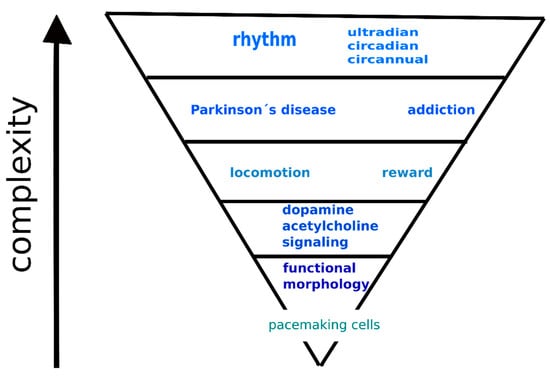 Thus, it is possible to propose a hierarchical model of the interactions between the dopamine and acetylcholine signaling systems in the striatum (see Figure 2). The complexity of interactions between these two neurotransmitter systems gradually increases, as further described below. The base of this model represents functional morphology, with respect to the fact that all neurons in the striatum can operate as pacemakers. The next highest mode of interaction between these two neurotransmitter systems is interaction at the neurotransmitter/receptor/signaling level. Furthermore, these interactions contribute to locomotor activity regulation and reward behavior. Relatively recently, some new findings revealed that both functions exhibit biological rhythmicity. These rhythms can be ultradian, circadian, or circannual or can show all rhythmic components. Similarly, pathologies such as Parkinson’s disease and addiction also exhibit rhythmic changes. For examples of how these interactions affect behavior, see Section 3.4.