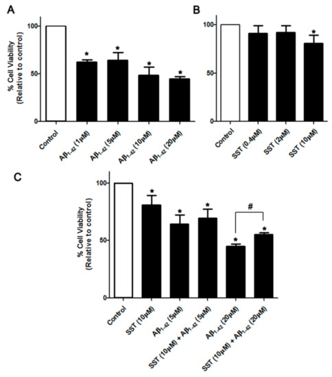 To determine cell viability in response to Aβ, SH-SY5Y cells were processed for the MTT (3-(4,5-dimethylthiazol-2-yl)-2,5-diphenyl tetrazolium bromide) assay, as previously described [42]. Briefly, differentiated SH-SY5Y cells were treated with increasing concentrations of Aβ1-42 (0, 1, 5, 10 and 20 μM) or SST (0.4, 2 and 10 μM) alone, and with the combination of Aβ1-42 (5 and 20 μM) and SST (10 μM) for 24 h. Post-treatment, the cells were washed with phosphate-buffered saline (PBS) and incubated for 2 h at 37 °C in the presence of 300 μg/mL of methyl-thiazolyl diphenyl-tetrazolium bromide solution (Sigma) prepared in serum-free DMEM. The cells were subsequently washed in PBS, and the resulting formazan formed in the cells was dissolved in 200 μL of isopropanol for 15 min on a rotating shaker. The changes in color were analyzed using a spectrophotometer at a wavelength of 570 nm, with the background absorbance measured at 650 nm. The results are presented as percentage changes between the treated versus the control group.