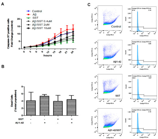 SST inhibits the Aβ-induced activation of apoptosis. (A) Apoptosis induction was assessed by measuring caspase-3/7 activity. Cells treated with Aβ (5 μM) alone displayed an elevation of caspase-3/7 activity, while cells treated with SST alone (10 μM) exhibited the lowest caspase-3/7 activity. Co-treatment of Aβ1-42 (5 μM) and SST resulted in reduced caspase-3/7 activity compared to the cells treated with Aβ1-42 alone. Data are shown as a fold-change against 0 h time point. (B) Cell viability assessed by a live/dead assay using metabolic activity and cell permeability as an index following treatment with Aβ (5 μM) and SST (10 μM) alone or in combination (C). Representative FACS data of C12-resazurin and SYTOX fluorescence intensity (dot plot) and FITC intensity distribution (histogram) displaying the distribution of cells based on viability. The cells were treated with Aβ (5 μM) and SST (10 μM) alone or in combination. The data represent the mean ± SD of three independent experiments.