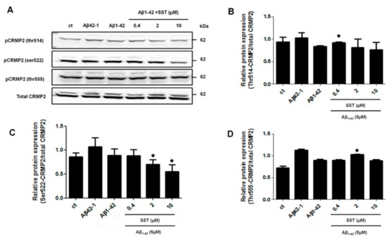 Furthermore, to determine changes in site-specific phosphorylation, three phosphorylation sites of CRMP2 that have been previously reported to be hyperphosphorylated in AD patients were selected (Thr514, Ser522 and Thr555) [46]. As shown in Figure 3, the phosphorylation levels of Thr514- or Thr555-CRMP2 did not show a dose-dependent response to any of the concentrations of SST in combination with Aβ1-42 (Figure 3, panels A, B, and D). Although the level of CRMP2 phosphorylation at site Ser522 was not relatively altered by Aβ1-42 alone, it was significantly downregulated in the presence of SST in a dose-dependent manner, with a maximal reduction in the presence of SST at 10 μM (Figure 3, panels A and C). Therefore, based on the cell viability assay and site-specific Thr522-CRMP2 phosphorylation, all subsequent experiments were performed using 10 μM of SST.