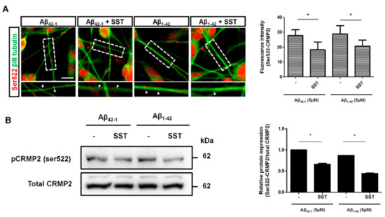 SST inhibits S522-CRMP2 phosphorylation. (A). Immunofluorescence staining image of Ser522-CRMP2 (red) co-stained with neuronal tubulin marker βIII-tubulin (green). The colocalization of Ser522-CRMP2 on neurites with βIII-tubulin is indicated (arrowhead; inset), and the average fluorescence intensity of S522-CRMP2 (in red) is shown on the bar graph. (B). Representative Western blot showing reduced phosphorylation at Ser522-CRMP2 in the presence of SST (bottom panel). The densitometry analysis of the Western blot is corroborated with a significant reduction in the phosphorylation level in the presence of SST in both Aβ42-1 and Aβ1-42 treated cells (upper panel). The data represent the mean ± SD of three independent experiments. * p < 0.05 against respective control; Scale bar = 20 µm.