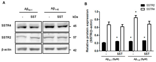 The biological effects of SST are mediated by binding to five different receptor subtypes (SSTR1-5). We recently reported the role of SSTR2 and 4 in promoting the RA-induced neuronal differentiation of SH-SY5Y cells [40]. Here, accordingly, we monitored the changes in the expression of SSTR2 and 4 following treatment with either Aβ1-42 alone or in combination with SST. Scrambled Aβ42-1 was used as a control. SH-SY5Y cells were treated with Aβ42-1 (5 μM) and Aβ1-42 (5 μM) in the presence and absence of SST (10 μM) for 24 h. Post-treatment, cell lysates were collected and processed for immunoblot analyses for the expression of SSTR2 and 4. As shown in Figure 5, the cells treated with Aβ42-1 in the presence of SST exhibited an increase in SSTR2 expression without any discernible changes in SSTR4 expression. In contrast, the SH-SY5Y cells treated with Aβ1-42 displayed an increased expression of both SSTR2 and 4 when compared to the cells treated with Aβ42-1. In the cells treated with SST in combination with Aβ1-42, SSTR2 expression remained higher than Aβ42-1-treated cells but was comparable to the cells treated with Aβ1-42 alone. Interestingly, the cells treated with Aβ1-42 in combination with SST showed a significant reduction of SSTR4 expression when compared to cells treated with Aβ1-42 alone. These results indicate SST-induced changes in subtype-specific receptor internalization, desensitization, and degradation.