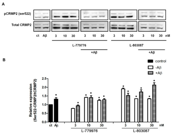 SSTR specific agonist effect on Ser522-CRMP2 phosphorylation. (A). Representative Western blot showing changes in the level of S522-CRMP2 phosphorylation in cells, following treatment with increasing concentrations of SSTR2 and SSTR4-specific agonist (3, 10, 30 nM) in the presence or absence of Aβ1-42 (5 μM). (B). The densitometry analysis of Western blot shows a significant inhibition of Ser522 phosphorylation upon treatment with L-779976 (3 nM) in the absence or presence of Aβ1-42. L-779976 (10 and 30 nM) alone, which resulted in the moderate elevation of phosphorylation at the Ser522 site compared to the untreated control. In the presence of Aβ1-42, L-779976 (10 and 30 nM) displayed moderate changes when compared to the cells treated with Aβ1-42. In the presence of Aβ1-42, L-803087 induced a dose-dependent increase of Ser522 phosphorylation, resulting in the highest level of expression at 30 nM treatment of L-803087. The data represent the mean ± SD of three independent experiments. * p < 0.05 against respective control.