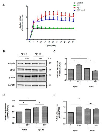 SST-mediated effects on calcium signaling and downstream mediators. (A). The intracellular level of Ca2+ was assessed using the Fluo-4 calcium indicator. Cells treated with Aβ1-42 resulted in an increased Ca2+ influx compared to the SST or untreated control. Cells treated with Aβ1-42 in the presence of SST resulted in a noticeable inhibition of the Ca2+ influx compared to the cells treated with Aβ1-42 alone. B. Representative Western blot displaying the changes in the expression of calpain, CDK5, and p35/25 expression in cells treated with Aβ1-42 in the presence or absence of SST. (C–E). Histograms represent the densitometry analysis of the Western blot shown in (B). Data represent the mean ± SD of three independent experiments. * p < 0.05 against respective control, Two-way ANOVA with Bonferroni post-hoc tests.