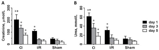 Glomerular and tubular functional parameters, creatinine (A) and urea (B) retention 1, 3 and 5 days after left kidney operation. CI: cold ischemia, I/R: ischemia-reperfusion, Sham: sham operated (n = 8 in all groups). *: p < 0.05 vs. sham, +: p < 0.05 vs. I/R (day 1).