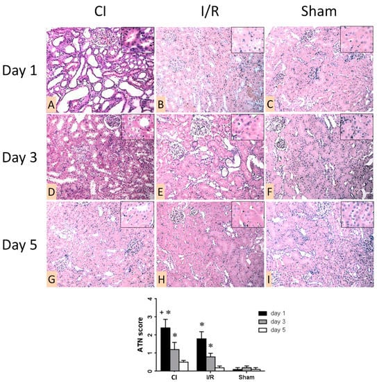 Representative morphologic images of operated left kidneys one (A–C), three (D–F), and five (G–I) days after the operation. First column (A,D,G): cold ischemia (CI). Second column (B,E,H): ischemia-reperfusion (I/R). Third column (C,F,I): sham. (hematoxylin–eosin (HE) staining, 200×). Inserts show proximal tubular damage (1000×). Graph: quantitative evaluation of acute tubular necrosis (ATN) score 1, 3 and 5 days after the operation (n = 8 in all groups). *: p < 0.01 vs. sham, +: p < 0.05 vs. I/R (day 1). (HE staining, 200×).