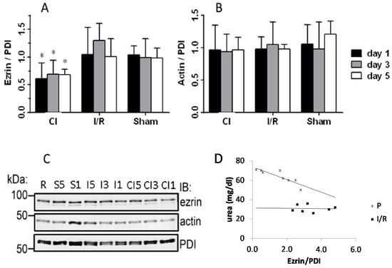 The expression level of ezrin normalized to PDI (Figure 3A) was similar in the I/R and sham groups compared to the average ezrin/PDI ratio measured in the right kidneys.