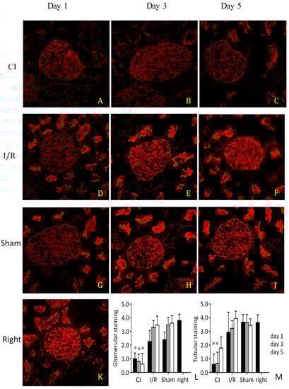 Indirect immunofluorescence for ezrin. Representative images of operated left kidneys, one (A,D,G), three (B,E,H), and five (C,F,J) days after surgery. First row (A,B,C): cold ischemia (CI). Second row (D,E,F): ischemia-reperfusion (I/R). Third row (G,H,J): sham. Fourth row: unoperated right kidney from a sham animal (K), (400×). Quantitation of glomerular (L) and tubular (M) ezrin staining intensity (score: 0–4, 0: no, 1: faint, 4: intense, sharp staining). *: p < 0.05 vs. corresponding sham (n = 8 in all groups).