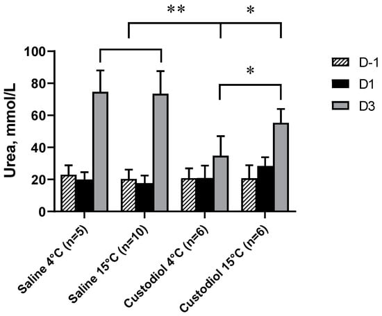 Plasma urea retention on days −1, 1 and 3 (D−1, D1, D3) in rats after flushing the kidneys with saline at 4 (n = 5) and 15 °C (n = 8) or Custodiol at 4 (n = 6) and 15 °C (n = 6) before a 30 min ischemia. Two-way repeated measure ANOVA with Tukey’s post hoc test. *: p < 0.05 between Custodiol at 4 and 15 °C and also between Custodiol at 15 °C and saline at both temperatures; **: p < 0.01 between saline at 4 and 15 °C and Custodiol at 4 °C.