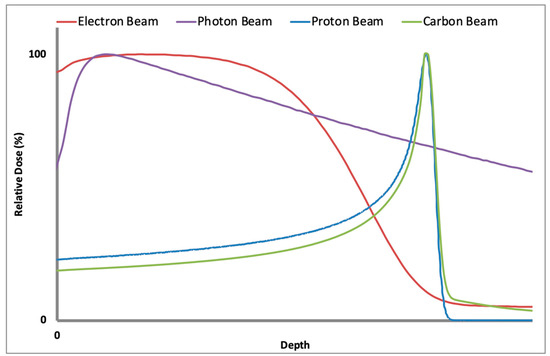 Proton and carbon ion radiation therapy, by contrast, offer dosimetric advantages over photon radiation therapy that create additional therapeutic possibilities [71]. Unlike photons, protons and carbon ions generate an initial low dose region as they traverse through the body. At the ends of their paths, they deposit their maximum dose in a narrow region known as the Bragg Peak. Beyond the Bragg Peak, the dose delivered falls off dramatically. Carbon ion beams have narrower Bragg Peaks than proton beams, and each carbon ion beam generates a fragmentation tail—a low-dose region past the Bragg Peak that results from the fragmentation of carbon ions as they interact with matter. These fragmentation products continue on their path and deposit dose distal to the Bragg Peak. When utilizing carbon ion radiation therapy, planners must take fragmentation tails into account when generating treatment plans to avoid excess dose deposition in critical structures [70,72]. Figure 1 depicts the different depth dose profiles for photons, electrons, carbon ions and protons. Note the presence of a Bragg Peak for both carbon ions and protons, as well as the fragmentation tail associated with the former.