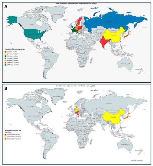 Global distribution of operation proton centers (A) and carbon ion centers (B) as of July 2020. Presently, there are 90 and 12 operational proton and carbon ion centers, respectively. Adopted from the Particle Therapy Co-Operative Group (https://www.ptcog.ch/index.php/facilities-in-operation). Figures generated using mapchart.net.