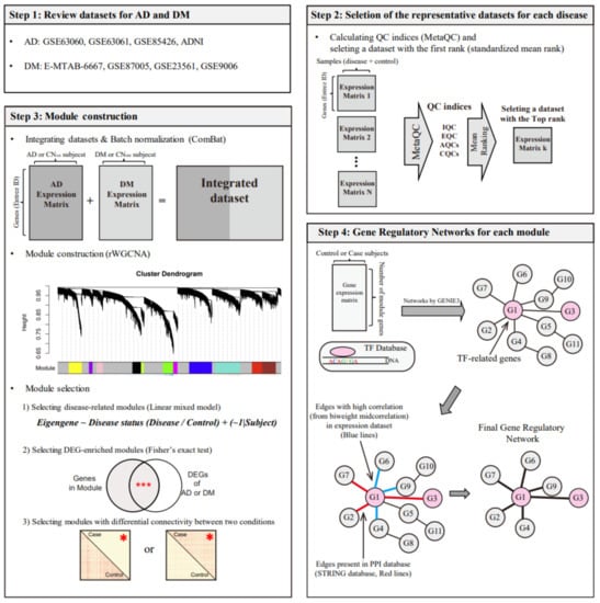 As shown in Figure 1, we analyzed publicly available datasets for the two diseases and selected representative datasets for each disease. The two selected datasets were integrated into one large dataset, which was used for the construction of a co-expression network, yielding several modules. We selected AD- and DM-related modules based on DE and DC analyses between the disease and control groups. From the selected module, we identified common transcription factors for AD and DM using a gene regulatory network (GRN) construction method (GENIE3) [20], a transcription factor (TF) database, gene expression correlation, and a protein-protein interaction (PPI) database.