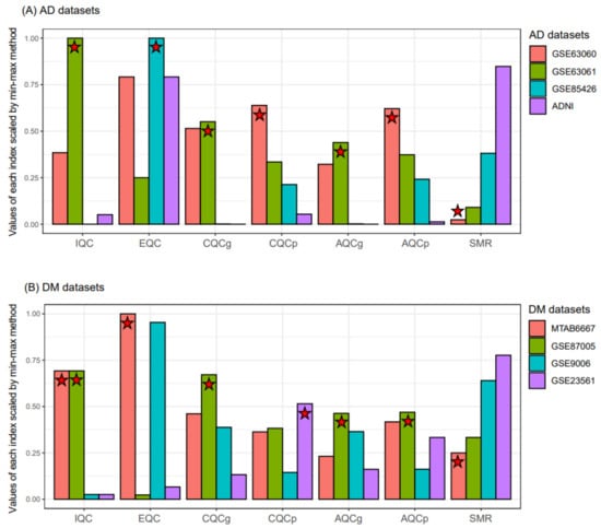 Instead of using all the RNA expression datasets, as has been done in other studies [35,36], we selected representative datasets for each disease using MetaQC [24]. We measured the six QC indices from three datasets iteratively selected from the four AD datasets, resulting in an AD study having three values for each QC index. Figure 2 shows the average values of the six QC indices and the SMR scaled by min-max normalization. Based on the average values of SMR, GSE63060 and MTAB6667 had the lowest values for AD and DM, respectively. Therefore, we selected GSE63060 and MTAB667 as representative blood RNA expression datasets for AD and DM, respectively.