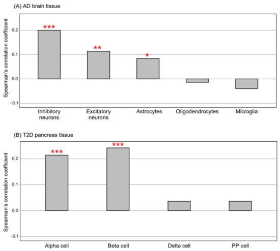 Comparison of gene expression between blood samples and disease-related tissue samples. (A) the AD brain dataset (single-cell transcriptomic analysis data) consisted of five cell types. Spearman’s correlation was used to compare the fold change values between AD and CNAD for all genes in the AD blood dataset (GSE63060) with those of the five cell types in the AD brain dataset. (B) the T2D pancreas dataset (single-cell transcriptomic analysis data) consisted of four cell types. Spearman’s correlation was used to compare the fold change values between DM and CNDM for all genes in the DM blood dataset (MTAB6667) with those of the four cell types in the DM pancreas dataset. ***, **, and one * indicate p < 0.001, p < 0.01, and p < 0.05, respectively (Spearman’s correlation). AD, Alzheimer’s disease; T2D, type 2 diabetes; PP, pancreatic polypeptide; DM, diabetes mellitus; CNAD, AD-matched control; and CNDM, DM-matched control.