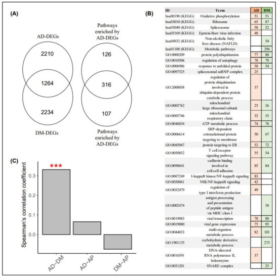 Differentially expressed genes and pathway analyses of AD and DM blood samples. (A) the Venn diagram on the left consists of the number of AD- and DM-DEGs, whereas the Venn diagram on the right includes the number of pathways enriched by AD- and DM-DEGs. (B) the reddish and greenish rectangles indicate pathways enriched via AD- and DM-DEGs, respectively. Numbers within rectangles represent the numbers of AD- and DM-DEGs in each pathway. (C) the y-axis indicates the Spearman’s correlation coefficient in the FC values for all genes between the disease and control samples in the AD, DM, and AP blood datasets. (***, p < 0.001; permutation test). AD, Alzheimer’s disease; DM, diabetes mellitus; AP, appendicitis; AD-DEG, differentially expressed genes between AD and AD-matched controls; DM-DEG, differentially expressed genes between DM and DM-matched controls; and FC, fold change.