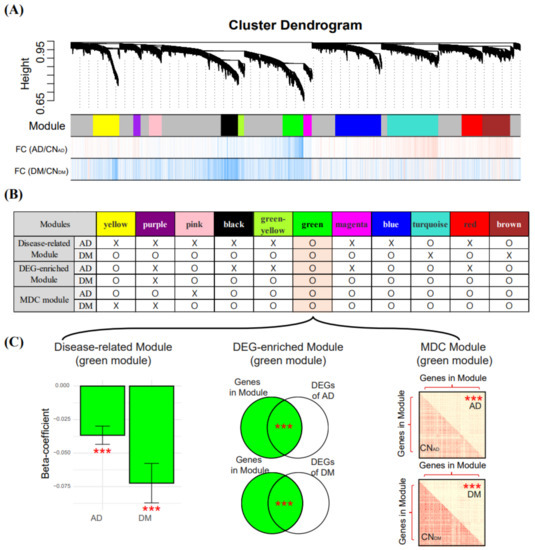By applying rWGCNA to the integrated blood dataset, we constructed 11 modules consisting of genes with similar expression patterns across samples (Figure 5A). We examined these 11 modules using the three approaches described in the Section 2 and selected regression-based disease-related modules, DEG-enriched modules, and MDC modules (Figure 5B). For AD, we selected green, turquoise, and brown modules that were related to AD (had a significant association with AD status and module-eigengene), significantly overlapped with the AD-DEGs, and demonstrated a significant differential connectivity between AD and CNAD. For DM, we selected seven modules (green, pink, black, greenyellow, magenta, blue, and red) that were shown via the three approaches to be related to DM. The green module was selected for both AD and DM; therefore, we defined the green module as the co-related module between AD and DM (Figure 5C).