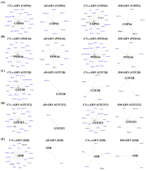 Five shared regulatory genes in GRNs. Four GRNs for (A) COPS4, (B) PSMA6, (C) GTF2B, (D) GTF2F2, and (E) SSB were established using the AD, CNAD, DM, and CNDM blood samples, respectively. GRNs were constructed by integrating GENIE3, the TF database, the PPI database, and correlation values of gene expression. Blue colors indicate down-regulated genes. A large size and black color indicate TF-related genes. Edges between two genes were constructed from GENIE3, the PPI database, and correlations of RNA expression data. Four GRNs per gene, constructed using AD, CNAD, DM, and CNDM samples, respectively, are illustrated. AD, Alzheimer’s disease; DM, diabetes mellitus; CNAD, AD-matched control; CNDM, DM-matched control; GRN, gene regulatory network; TF, transcription factor; and PPI, protein-protein interaction.