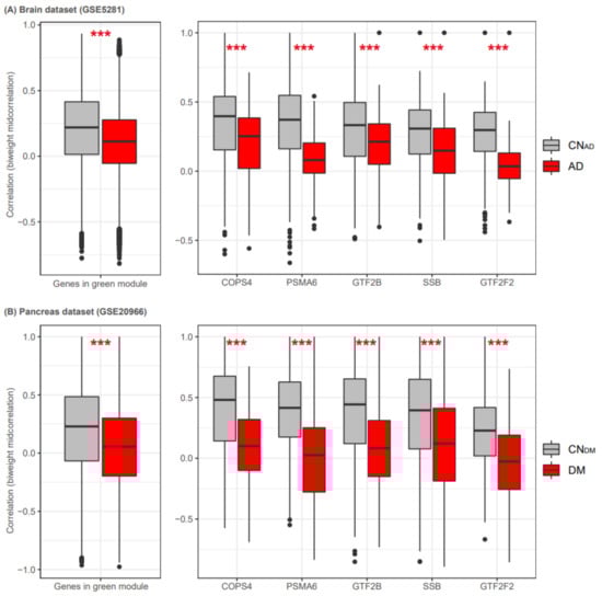 To compare the differential connectivity of the green module between the disease and control blood samples with that of other tissues, we analyzed gene expression in datasets for AD and CNAD brain tissue samples (GSE5281) and DM and CNDM pancreas tissue samples (GSE20966). Detailed information on the pre-processing of the two datasets is presented in the Supplementary Materials. The brain tissue dataset (GSE5281) contained gene expression values for 420 of the 467 genes in the green module. Using all pairs of the 420 genes, we constructed two separate biweight midcorrelation matrices for AD and CNAD samples. The results showed that the 420 genes in the AD brain had lower correlation values than those in the CNAD brain (p < 2.2 × 10−16, t-test). Specifically, the five genes COPS4, PSMA6, GTF2B, GTF2F2, and SSB had lower correlation values in the AD dataset than in the CNAD dataset (Figure 7). The pancreas dataset (GSE20966) contained gene expression values for 435 of the 467 green module genes. We also constructed two separate biweight midcorrelation matrices for DM and CNDM using all pairs of the 435 genes. The 435 genes had lower correlational values in the DM pancreas dataset than in the CNDM pancreas dataset (p < 2.2 × 10−16, t-test). Additionally, the five TF-related genes had lower correlation values in the DM dataset than in the CNDM dataset. These results confirmed that these five genes had differential connectivity in disease-related tissues.