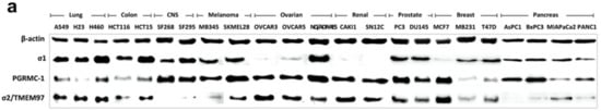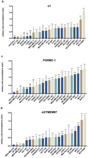 3.1. σ1 Receptor, PGRMC1, and σ2/TMEM97 Were Heterogeneously Expressed in 23 Human Cancer Cell Lines