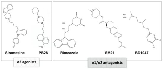 Chemical structures of the selected sigma receptors agonists and antagonists siramesine, PB28 dihydrochloride (PB28), rimcazole, SM21 maleate (SM21), and BD1047 dihydrobromide (BD1047).