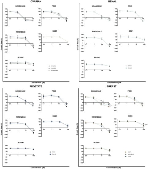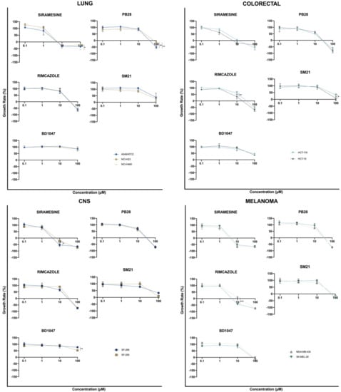 Twenty-three established human cancer cell lines were treated with the sigma ligands for 48 h at various concentrations (100, 10, 1, and 0.1 μΜ), and a cell viability assay (SRB) was performed. Dose–response curves were generated after incubation with different concentrations of the various sigma ligands (Figure 3).