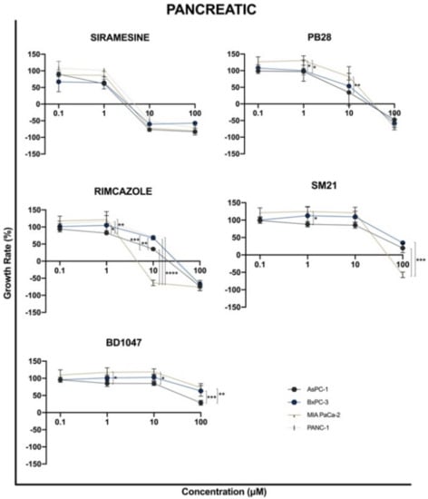 Dose–response effect of the selected sigma ligands siramesine, PB28 dihydrochloride (PB28), rimcazole, SM21 maleate (SM21) and BD1047 dihydrobromide (BD1047) in 23 human cancer cell lines. Cells were exposed to different concentrations of the compounds for 48 h and growth rates were calculated with sulforhodamine B (SRB) assay. All compounds were tested at four concentrations (one log serial dilutions from 10−4 M to 10−7 M). The results are the average of three independent experiments; each one ran in triplicate. * p ≤ 0.05; ** p ≤ 0.01; *** p ≤ 0.001; **** p ≤ 0.0001.