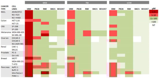 From the dose–response curves, GI50, TGI, and LC50 parameters were calculated for each cell line, representing the antiproliferative, cytostatic, and cytotoxic effects, respectively. Therapeutic index (TI) was also calculated as LC50 to GI50 ratio, determining the relative safety of the compounds (Table 1).