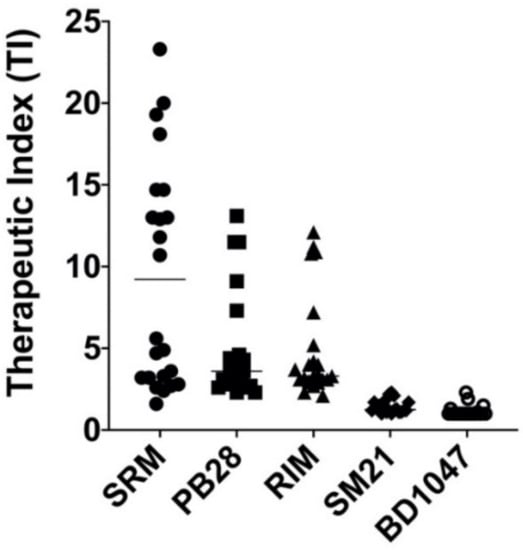 Therapeutic index (TI) values of the selected sigma ligands (SRM, PB28, RIM, SM21, and BD1047) for the 23 human cancer cell lines tested in this study. SRM: siramesine; RIM: rimcazole. Note: In cases where GI50 and LC50 were higher than the highest tested concentration (100 μM), the TI was calculated using GI50 and LC50 at 100 μΜ.
