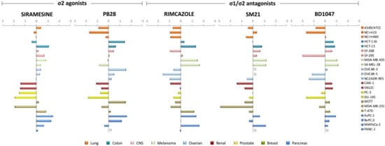 We next sought to identify possible patterns in the sigma ligands’ sensitivity profiles that could be related to the sigma ligands activity as either agonists or antagonists. GI50 values were normalized using the z-score statistical parameter and grouped by cancer type (Figure 6). The z-score normalization reflects the GI50 deviation from the mean, in terms of standard deviation. Positive and negative values were plotted along a vertical line that represents the mean GI50 value of all the cell lines against the tested sigma ligand. Negative values, projected to the right, represent cellular sensitivities that exceed the mean (i.e., more sensitive cell lines), while positive values, projected to the left, represent cell lines less sensitive to the mean (i.e., more resistant cell lines). Figure 6 shows that there was no distinct sensitivity pattern of the sigma ligands studied herein, regardless of their receptor specificity or the agonistic/antagonistic classification. Instead, it seemed that there was a general sensitivity/resistance pattern, discrete for each cell line, against the effect of the selected sigma ligands. These distinct responses may reflect a cell line or, in some cases, tissue-dependent sigma ligand effect. Indeed, our data suggest that all the lung, renal, and prostate cancer cell lines tested are resistant against all the studied sigma ligands, whereas all colorectal, melanoma, and pancreatic cancer cell lines appeared to be sensitive against the effect of all sigma ligands studied. Focusing on siramesine, which our data indicates has the best in vitro anticancer efficacy, it appears that pancreatic cancer cell lines are more sensitive against siramesine’s activity, suggesting that siramesine should be further investigated as a novel putative therapeutic approach in the treatment of pancreatic cancer.