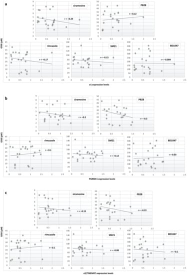 Scatter plots correlating sigma ligand antiproliferative efficacy (GI50) versus σ1 expression levels (a), PGRMC1 expression levels (b), and σ2/TMEM97 expression levels (c).