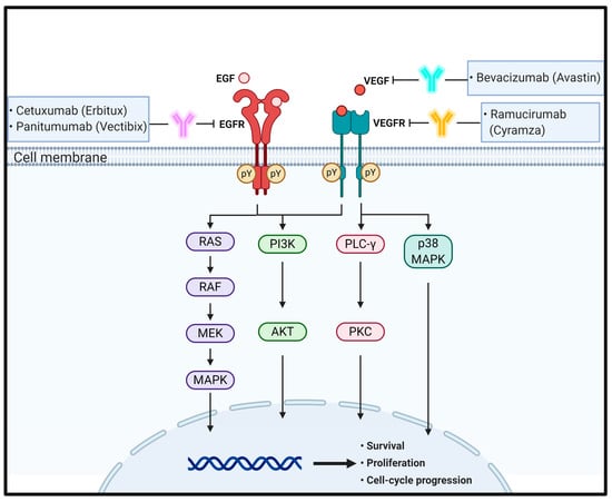 Schematic representation of the physiological roles and signaling pathways of EGF and VEGF and their cognate receptors and the effect of antibodies targeting these signaling molecules on CRC progression and metastasis. pY means phosphotyrosine residues.