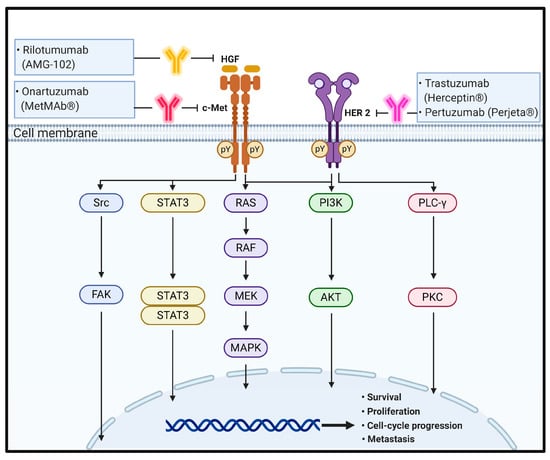 In the physiological state, HGF binding to c-MET induces c-MET dimerization and trans-autophosphorylation of the tyrosine residues Y1003 in the juxtamembrane domain and Y1234 and Y1235 within the kinase activation loop, resulting in phosphorylation of two tyrosine residues, Y1349 and Y1356, in the C-terminus. Tyrosine phosphorylation of Y1349 and Y1356 residues creates docking sites for recruitment of key intracellular adaptor proteins and signaling molecules through SH2-mediated interactions, including GRB2, GRB2-associated binding protein 1 (GAB1), signal transducer and activator of transcription 3 (STAT3), the p85 subunit of PI3K, SRC, PLC-γ, and Shc [,]. The potency, duration, and versatility of HGF/c-MET signaling are modulated by signaling amplifiers and co-receptors. Recruitment and sustained phosphorylation of the multi-adaptor protein GAB1 is an important hallmark of sustained c-MET signaling that can either bind directly to c-MET through its unique 13-amino-acid c-MET binding site or indirectly by association with GRB2. The tyrosine-phosphorylated GAB1 protein serves as an auxiliary signal transduction platform through recruitment of various effector proteins, including PI3K. Cell survival response is related to the PI3K/Akt pathway activated by c-MET signaling [,]. Furthermore, HGF-induced c-MET-dependent RAS/RAF/MAPK activation has been found to require the co-receptor CD44v6, thus providing a platform for SOS recruitment to the complex and subsequently triggering proficient activation of RAS []. Invasion, branching morphogenesis, and tumorigenesis are mediated by STAT3 activation in a tissue-dependent manner. Typically, STAT3 activation is induced by phosphorylation on a critical tyrosine residue (Y705) that triggers STAT3 dimerization owing to reciprocal phosphotyrosine-SH2 domain interactions. In addition to tyrosine 705 phosphorylation, STAT3 is also activated through serine (S727) phosphorylation. Finally, the reversible acetylation of STAT3 by histone acetyltransferase on a single lysine residue (K685) represents a third mechanism of STAT3 activation. Acetylated STAT3 enhances the stability of STAT3 dimers, which are required for DNA-binding and transcriptional activity. Cellular migration and adhesion are mediated by a c-MET–SRC–focal adhesion kinase (FAK) interaction. Within the complex, Src phosphorylates Y576 and Y577 within the kinase domain activation loop and Y861 and Y925 within the C-terminal domain of FAK. The FAK–Src complex further binds to and phosphorylates various adaptor proteins, such as p130Cas and paxillin [,,] (Figure 2).