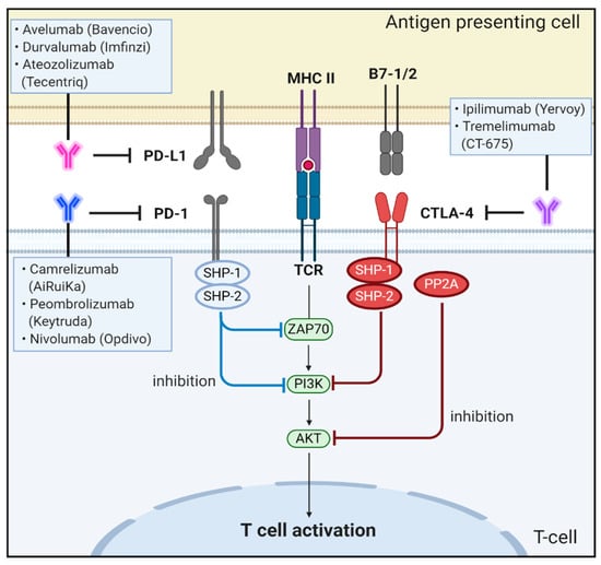 Under physiological conditions, when T cells recognize antigens on major histocompatibility complex of the target cell, inflammatory cytokines, such as tumor necrosis factor alpha and interferon gamma (IFNγ) are produced to initiate inflammatory processes. These cytokines upregulate the expression of PD-L1 on tissues and PD-1 on T cells. In turn, PD-1 directly interacts with PD-L1 to negatively regulate T-cell receptor (TCR) signaling, inhibits interleukin-2 (IL-2) production in T cells, and increases T-cell apoptosis [,]. Specifically, this PD-1/PD-L1 interaction induces lymphocyte-specific protein tyrosine kinase-induced phosphorylation of two tyrosine-based motifs within ITIM and ITSM of the cytoplasmic tail of PD-1. The recruitment of Src homology 2 (SH2) domain-containing protein tyrosine phosphatase 1 (SHP1) and SHP-2 phosphatase then induces dephosphorylation of the TCR signalosome, including CD3ζ, ZAP70, and PI3K kinases, resulting in the deactivation of downstream signaling targets []. Moreover, the PD-1/PD-L1 interaction also downregulates the protein (casein) kinase 2 expression that phosphorylates the regulatory domain of phosphatase and tensin homolog (PTEN) and inhibits phosphatase activity to remove PIP3 produced by PI3K [,,]. Thus, PTEN can terminate PI3K activities by dephosphorylating PIP3, which eventually leads to immune tolerance, a phenomenon in which the immune system loses the control to mount an inflammatory response even in the presence of actionable antigens [,] (Figure 3).