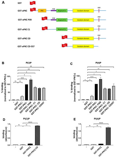 To further confirm the data obtained through lipid overlay assays and to identify the aPKC domains responsible for binding, we performed the ELISA technique using Cova PIP screening plates that were precoated with 20 nmols of either PI(3)P or PI(4)P per well, preblocked and ready for the addition of the proteins. On those plates, we used in-house purified GST-tagged full-length aPKCs and their deletion mutants and detected their binding using anti-GST antibodies. The constructs used are described in Figure 3A [12]. We used the same concentrations of purified GST as in the negative control.