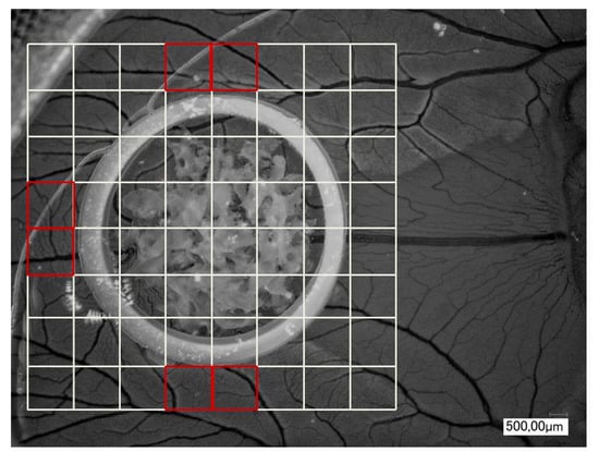To evaluate the influence of BSM/PRF on angiogenesis in vivo, a chorioallantoic membrane (CAM) assay was used, as previously described [,]. The samples, both native (AKM, APKM, XMK1, and XKM2) and with PRF bio-activated BSMs (AKM+, APKM+, XKM1+, and XKM2+), were assessed and compared to the control of the CAM alone (Ctrl.), as well as the pure PRF (triplets per sample; total n = 36). In brief, fertilized white Leghorn chicken eggs (LSL Rhein-Main, Dieburg, Germany) were incubated at 38 °C at constant humidity until the fourth day of embryological development. Then, 8–10 mL of egg white were removed with a sterile syringe, and a 3 × 3 cm2 window was cut into the eggshell under sterile conditions. After another 24 h, we applied a sterile orthodontic elastic rubber ring (Elastics, Dentaurum, Ispringen, Germany), into which the samples were inserted. After 24 h of incubation, analysis in 30-fold and 50-fold magnification by centering the ring was performed using a digital microscope (KEYENCE, Neu-Isenburg, Germany) and its software (KEYENCE, Neu-Isenburg, Germany) after overlaying a grid (with a 500 μm side length) over the micrographs and manually counting all vessels and branching points of the vessels in six defined regions of interest per mm2 around the ring (Figure 1). Afterwards, the embryos were euthanized by cutting the main vessels.