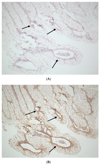 Exemplary samples of the CAM (2× magnification) after incubation of allogeneic BSMs with platelet-rich fibrin (PRF) for 24 h displayed immunohistochemically via hematoxylin–eosin (HE) (A) and smooth muscle actin (SMA) (B) antibodies. Arrows indicate vessel formation.