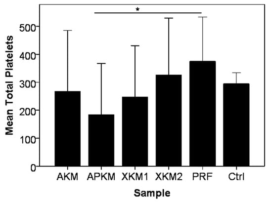 PRF alone showed a higher mean platelet count × 103/µL than whole blood without reaching any reaching statistical significance (p = 0.161). The incubation of PRF with all tested BSMs led to a decrease of platelets (AKM: p = 0.340; XKM1: p = 0.161; and XKM2: p = 0.796), with APKM showing the strongest decrease in comparison to PRF alone (p = 0.05; Table 1 and Figure 3).