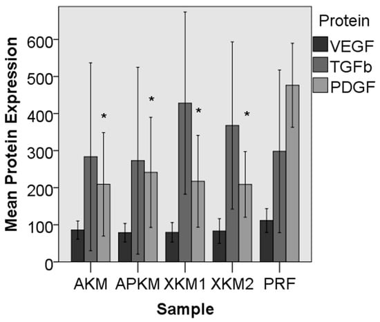 Expression of VEGF, TGF, and PDGF in the BSM samples incubated with PRF in comparison to PRF alone. PDGF was statistically significantly decreased for all tested BSMs in comparison to PRF alone (* p < 0.05; for detailed p-values, please refer to the text).