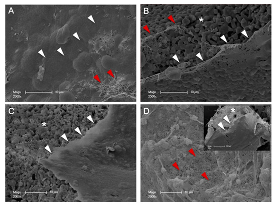 SEM: allogeneic (A), alloplastic (B), xenogenic material 1 (C), and xenogeneic material 2 (D) with PRF-biofunctionalization. The surfaces of the bone substitutes (*) were covered by a thin PRF-layer (white arrows) that was created by closely networked fibrin fibers (red arrows).