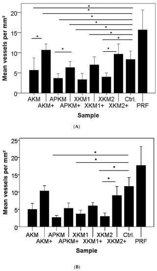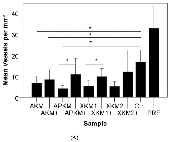 To visualize newly formed vessels, immune-histochemical staining for HE and αSMA was performed, as indicated in representative micrographs (triplets per sample; n = 36). For HE (Figure 7A and Table 4A) and αSMA staining (Figure 7B and Table 4B), no significant differences between the groups were found (p = 0.15). Furthermore, PRF alone did not significantly increase vessel amount in comparison to the negative control (HE: p = 0.184; αSMA: p = 0.077). After HE staining, BSMs with or without PRF had decreases in new vessels in comparison to the negative control (AKM: p = 0.046; AKM + PRF: p = 0.500; APKM: p = 0.046; APKM + PRF: p = 0.050; XKM1: p = 0.046; XKM1 + PRF: p = 0.050; XKM2: p = 0.050; and XKM2 + PRF: p = 0.184). In contrast, vessel formation was significantly increased when the bio-activated allogeneic, alloplastic, and xenogeneic BSMs were compared to the native control except for XKM1 (AKM vs. AKM + PRF: p = 0.046; APKM vs. APKM + PRF: p = 0.046; XKM1 vs. XKM1 + PRF: p = 0.072; and XKM2 vs. XKM2 + PRF: p = 0.05). After αSMA staining, native BSMs displayed less vessels in comparison to the negative control (AKM: p = 0.184; AKM+ PRF: p = 0.184; APKM: p = 0.046; APKM + PRF: p = 0.184; XKM1: p = 0.050; XKM1 + PRF: p = 0.376; XKM2: p = 0.050; and XKM2 + PRF: p = 0.376). In contrast, vessel formation was significantly increased when the bio-activated allogeneic and alloplastic BSMs, as well as XKM2, were compared to the native control (AKM vs. AKM + PRF: p = 0.077; APKM vs. APKM + PRF: p = 0.072; XKM1 vs. XKM1 + PRF: p = 0.077; and XKM2 vs. XKM2 + PRF: p = 0.050).