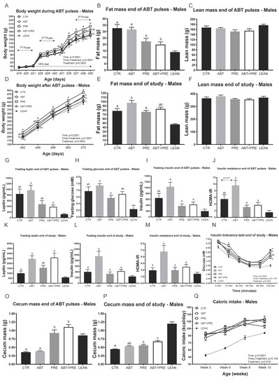Pulsed early life antibiotic exposure and weaning onto a high fat/sucrose diet increases body weight, fat mass and insulin levels/resistance in males, all reversible with prebiotic co-administration. (A) Body weight of males during antibiotic pulses (n = 8 rats/group). (B) Fat mass and (C) Lean mass of males at the end of antibiotic pulses (n = 7–10 rats/group). (D) Body weight of males after antibiotic pulses (n = 8 rats/group). (E) Fat mass and (F) Lean mass of males at the end of the study (n = 7–10 rats/group). Portal vein leptin (G) and insulin (I) levels of males measured at the end of antibiotic pulses (n = 7–10 rats/group). (H) Fasting glucose of males measured at the end of antibiotic pulses via tail bleed (n = 8–10 rats/group). (J) Insulin resistance of males at the end of antibiotic pulses (n = 8–9 rats/group). Portal vein leptin (K) and insulin (L) levels of males at the end of the study (n = 7–9 rats/group). (M) Insulin resistance of males at the end of the study (n = 8 rats/group). (N) Glucose response to insulin in males measured by ITT at the end of the study (n = 8–10 rats/group). (O,P) Cecum mass in males at the end of antibiotic pulses (O) and end of study (P) (n = 7–10 rats/group). (Q) Average caloric intake (kilocalories) of males calculated as the average of energy intake over 4 days measured at 4 different weeks of life (n = 6–8 rats/group). Results are shown as mean ± SEM. The superscripts a,b indicate significant differences between groups where labelled means without a common superscript letter differ, p < 0.05 (i.e., ‘a’ and ‘b’ differ; ‘ab’ does not differ from ‘a’ or ‘b’). CTR, control; ATB, antibiotic; PRE, prebiotic; ATB + PRE, antibiotic + prebiotic; LEAN, lean control; d, day of life.