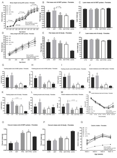 Pulsed early life antibiotic exposure and weaning onto a high fat/sucrose diet increases body weight and insulin levels/resistance in females, all reversible with prebiotic co-administration. (A) Body weight of females during antibiotic pulses (n = 9 rats/group). (B) Fat mass and (C) Lean mass of females at the end of antibiotic pulses (n = 7–10 rats/group). (D) Body weight of females after antibiotic pulses (n = 9 rats/group). (E) Fat mass and (F) Lean mass of females at the end of the study (n = 8–10 rats/group). Portal vein leptin (G) and insulin (I) levels of females measured at the end of antibiotic pulses (n = 8–10 rats/group). (H) Fasting glucose of females measured at the end of antibiotic pulses via tail bleed (n = 8–9 rats/group). (J) Insulin resistance of females was calculated at the end of antibiotic pulses (n = 8–10 rats/group). Portal vein leptin (K) and insulin (L) levels of females measured at the end of the study (n = 7–9 rats/group). (M) Insulin resistance of females was calculated end of study (n = 8–10 rats/group). (N) Glucose response to insulin in females measured by ITT at the end of the study (n = 7–10 rats/group). (O,P) Cecum mass in females at the end of antibiotic pulses (O) and end of study (P) (n = 8–10 rats/group). (Q) Average caloric intake (kilocalories) of females calculated as the average of energy intake over 4 days measured at 4 different weeks of life (n = 6–8 rats/group). Results are shown as mean ± SEM. The superscripts a,b indicate significant differences between groups where labelled means without a common superscript letter differ, p < 0.05 (i.e., ‘a’ and ‘b’ differ; ‘ab’ does not differ from ‘a’ or ‘b’). CTR, control; ATB, antibiotic; PRE, prebiotic; ATB + PRE, antibiotic + prebiotic; LEAN, lean control; d, day of life.