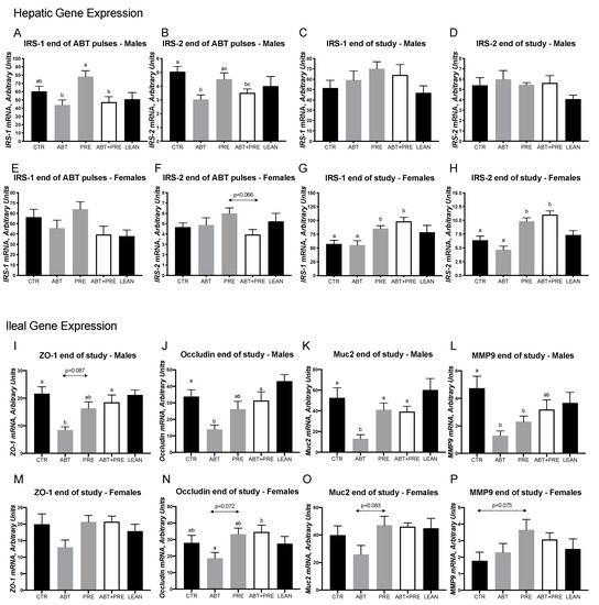 Early life pulsed antibiotic exposure impacts hepatic and ileal gene expression in males and females. Hepatic IRS-1 (A) and IRS-2 (B) expression in males after antibiotic pulses and at the end of the study (C,D respectively). Hepatic IRS-1 (E) and IRS-2 (F) expression in females after antibiotic pulses and at the end of the study (G,H respectively). Ileal ZO-1 (I), occludin (J), Muc2 (K) and MMP9 (L) expression in males at the end of the study. Ileal ZO-1 (M), occludin (N), Muc2 (O) and MMP9 (P) expression in females at the end of the study. Results are shown as mean ± SEM (n = 7–10 rats/group). The superscripts a,b indicate significant differences between groups where labelled means without a common superscript letter differ, p < 0.05 (i.e., ‘a’ and ‘b’ differ; ‘ab’ does not differ from ‘a’ or ‘b’). CTR, control; ATB, antibiotic; PRE, prebiotic; ATB + PRE, antibiotic + prebiotic; LEAN, lean control; IRS-1, insulin receptor substrate-1; IRS-2, insulin receptor substrate-2; ZO-1, zonula occludens-1; Muc2, Mucin 2; MMP9, matrix metalloproteinase 9.