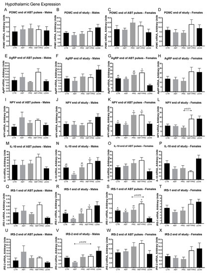 Given the importance of the hypothalamus in maintaining energy and glucose homeostasis and the link between microbiota and central inflammation, we next investigated the expression of relevant genes in the hypothalamus (Figure 4A–T). While no differences in the expression of pro-opiomelanocortin (POMC) (Figure 4A,B), agouti-related peptide (AGRP) (Figure 4E,F) and neuropeptide Y (NPY) (Figure 4I,J) were seen in males at any time point, female ABT + PRE had increased expression of AGRP compared to ABT at the end of the ABT pulses (Figure 4G) and NPY expression was significantly upregulated in PRE and ABT + PRE compared to ABT at the end of the pulses (Figure 4K). Lower expression of the anti-inflammatory cytokine interleukin-10 (IL-10) (Figure 4N), IRS-1 (Figure 4R) and IRS-2 (p = 0.079; Figure 4V) was seen in ABT males compared to ABT + PRE males at the end of the study. Similarly, lower hypothalamic expression of IRS-1 (Figure 4S) was seen in the female ABT group at the end of the ABT pulses compared to the ABT + PRE group but not at the end of the study (Figure 4T). No differences were seen in POMC (Figure 4C,D), IL-10 (Figure 4O,P) and IRS-2 (Figure 4W,X) expression in females at any time point. Likewise, no differences were seen at the end of the ABT pulses for IL-10 (Figure 4M), IRS-1 (Figure 4Q) and IRS-2 (Figure 4U) expression in males.
