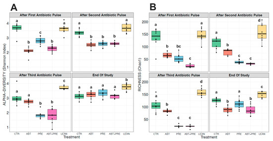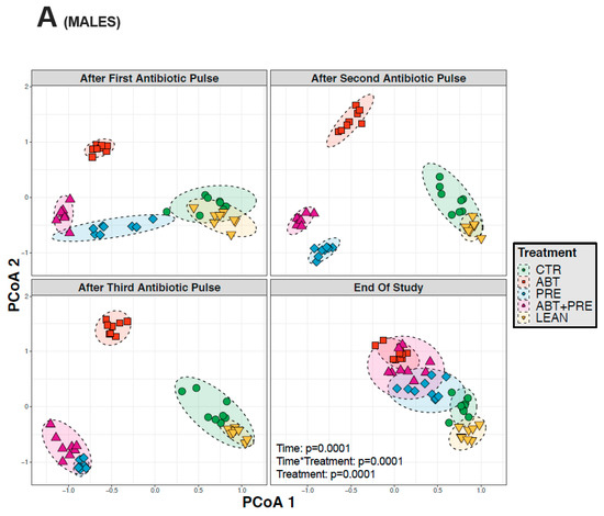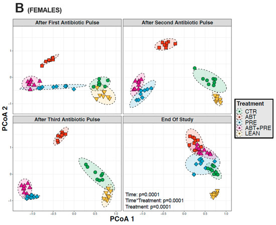 Many environmental and lifestyle factors such as diet and antibiotics can profoundly alter gut microbiota throughout life [35]. We therefore collected fecal samples after each PAT and monitored changes over time. PERMANOVA analysis showed that treatment was the strongest driver of bacterial community structure explaining 35.5% in males and 33.8% in females (β diversity, p = 0.001), whereas the experimental time point explained 12.2% of the variation in males (p = 0.001; Figure 5A) and 13.2% in females (p = 0.001; Figure 5B). The response in community structure in males and females changed over time depending on the treatment (R2 = 18.3% for males; R2 = 19.4%, for females; p = 0.001) and the model explained a total of 66% (males) and 66.4% (females) of the changes in the bacterial community assembly. A reduction in alpha-diversity in males (Figure 6A,B) and females (Figure 7A,B) was seen in antibiotic and prebiotic groups when compared to controls, however, differences between groups disappeared once antibiotics and/or prebiotics were discontinued at the end of the study.