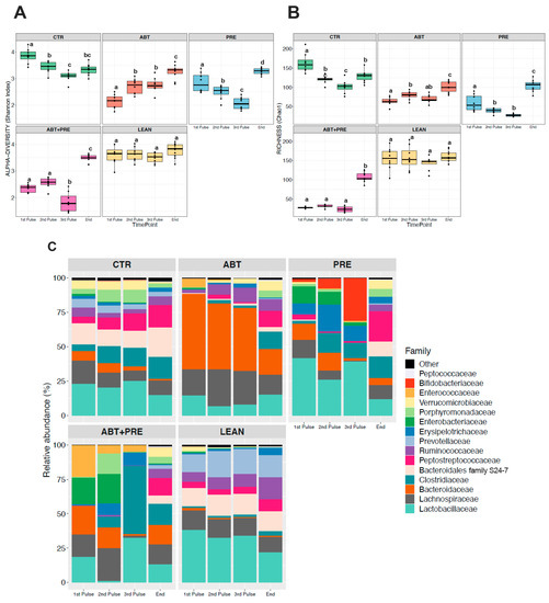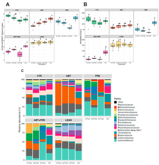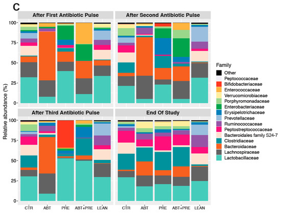 Considering microbial communities that reside in the gut, environmental perturbations (i.e., antibiotics) and lack of microbiota stability in the first three years of life [36], we decided to investigate microbial maturation/development for each experimental group separately over time (Figure 8 and Figure 9). Antibiotic male (Figure 8C) and female (Figure 9C) gut microbiota development was disrupted with antibiotics, demonstrated by the bloom in Bacteroidaceae after each antibiotic pulse that contrasted with the control groups (CTR and LEAN) where levels remained relatively stable over time. Furthermore, Lactobacillaceae levels decreased over time in control/lean control groups in males (Figure 8C) and females (Figure 9C), peaking immediately after weaning (1st pulse). However, in antibiotic groups, the trend was the opposite as the highest levels of Lactobacillaceae were seen at the end of study, especially in males (Figure 8C). Bacteroidales family S24-7 and Peptostreptococcaceae were depleted in antibiotic/prebiotic groups during the intervention (1st–3rd pulse) in males (Figure 8C) and females (Figure 9C) and levels increased only at the end of the study. On the contrary, control/lean control groups had higher levels of Bacteroidales family S24-7 and Peptostreptococcaceae and these taxa were stable over time (1st pulse–end of the study). Prebiotic group (PRE) gut microbiota development also differed from control and antibiotic groups (CTR/LEAN/ABT) with higher Bifidobacteriaceae levels seen after the 3rd pulse in males (Figure 8C) and females (Figure 9C). However, when prebiotics were co-administered with antibiotics (ABT + PRE), a bloom in Clostridiaceae was seen instead in males (Figure 8C) and females (Figure 9C). Interestingly, while a HFS diet in control (CTR) and prebiotic groups (PRE and ABT + PRE) decreased α-diversity over time (from 1st until 3rd pulse) in males (Figure 8A,B) and females (Figure 9A,B), the opposite occurred in ABT groups as α-diversity increased.