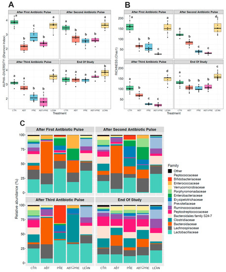 Between-group variations in alpha-diversity of gut bacterial communities and relative abundances of the 15 most abundant bacterial families in female rats over time. Shannon diversity (A) and Chao1 estimated richness (B) display between-group differences in alpha-diversity in female rats over time (n = 8–10 rats per group/time point). ANOVA with Tukey post-hoc test; p < 0.05. (C) Between-group relative abundances of the 15 most abundant bacterial families in female rats after the first, second, third antibiotic exposure and at the end of the study. Kruskal-Wallis test with Dunn post-hoc tests and Benjamin-Holmes False Discovery Rate (FDR) correction; The superscripts a,b,c,d indicate significant differences between groups where labelled means without a common superscript letter differ, p < 0.05 (i.e., ‘a’ and ‘b’ differ; ‘ab’ does not differ from ‘a’ or ‘b’). (To see significant differences between groups: Supplemental Table S3). CTR, control; ABT, antibiotic; PRE, prebiotic; ABT + PRE, antibiotic + prebiotic; LEAN, lean control.