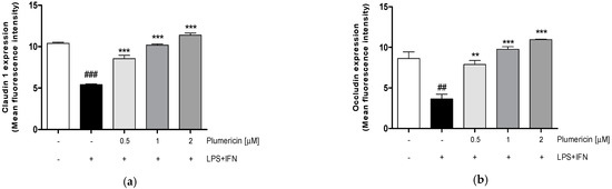 Mucosal inflammation as observed in colitis compromises the epithelial barrier, resulting in the exposure of lamina propria to luminal antigens and microbes that further contribute to the inflammatory response and barrier defects [37]. Adhesion proteins play a key role in maintaining the integrity of the intestinal epithelial barrier. However, several studies have reported differential effects of inflammatory mediators on adhesion proteins during IBD [38]. In order to assess plumericin’s ability to modulate the expression of adhesion molecules, such as Claudin-1, Occludin, and E-cadherin, in inflammatory conditions, we analyzed their expression by flow cytometry. Our results indicated that plumericin (0.5–2 µM) significantly increased Claudin-1 (p < 0.001 vs. LPS + IFN; Figure 1a), Occludin (p < 0.001 vs. LPS + IFN; Figure 1b), and E-cadherin (p < 0.001 vs. LPS + IFN; Figure 1c) expression, in LPS + IFN stimulated IEC-6.
