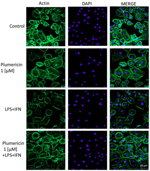 During the restitution of IECs, extensive reorganization of the actin cytoskeleton is necessary. For this reason, confocal microscopy was used to examine the effect of plumericin (1 µM) in normal and in inflammatory conditions on the assembly of actin stress fibres, that play a crucial role in the remodeling, stretching, and migration of epithelial cells. Untreated cells showed an intact actin cytoskeleton and its fibers traversing the cytosol. Addition of LPS + IFN caused a weak reorganization of actin filaments characterized by their redistribution to the cell subcortical compartment and subsequent cell. Moreover, in the presence of LPS + IFN, plumericin produced a reversion of this effect (Figure 2).